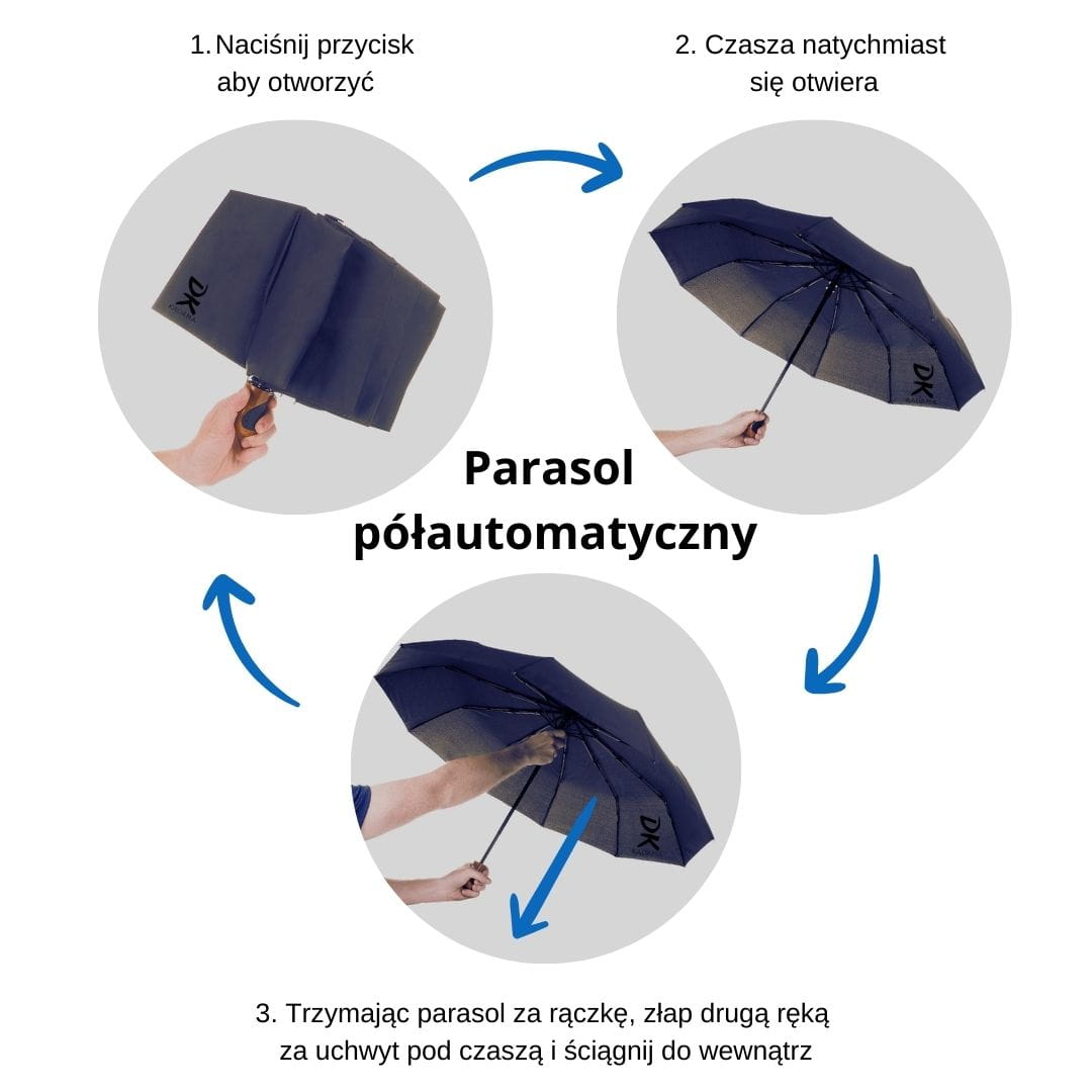 - Parasol półautomatyczny - automatycznie rozkładanie parasolki przy pomocy jednego przycisku,